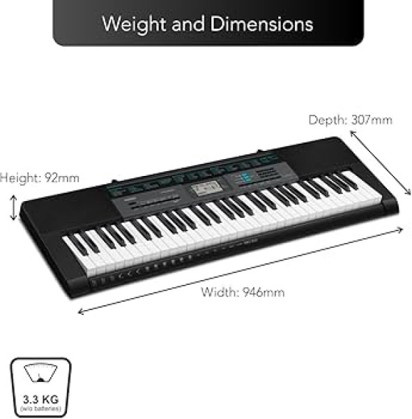 A 61-key piano-style keyboard with 400 built-in tones and 100 auto-accompaniment rhythms, ideal for a wide range of musical styles. Features a Dance Music Mode (50 dance rhythms), 100 one-touch presets that match the rhythm instantly, and 10 types of reverb + Virtual Hall for rich sound. Includes 60 built-in songs, a step-up lesson system (voice fingering guide, scoring), and Chordana Play app support to load more songs. Connectivity includes stereo audio-in, headphone output, and sustain pedal jack. Powered by 6 × AA batteries (~19 hrs) or a 9.5 V AC adapter.